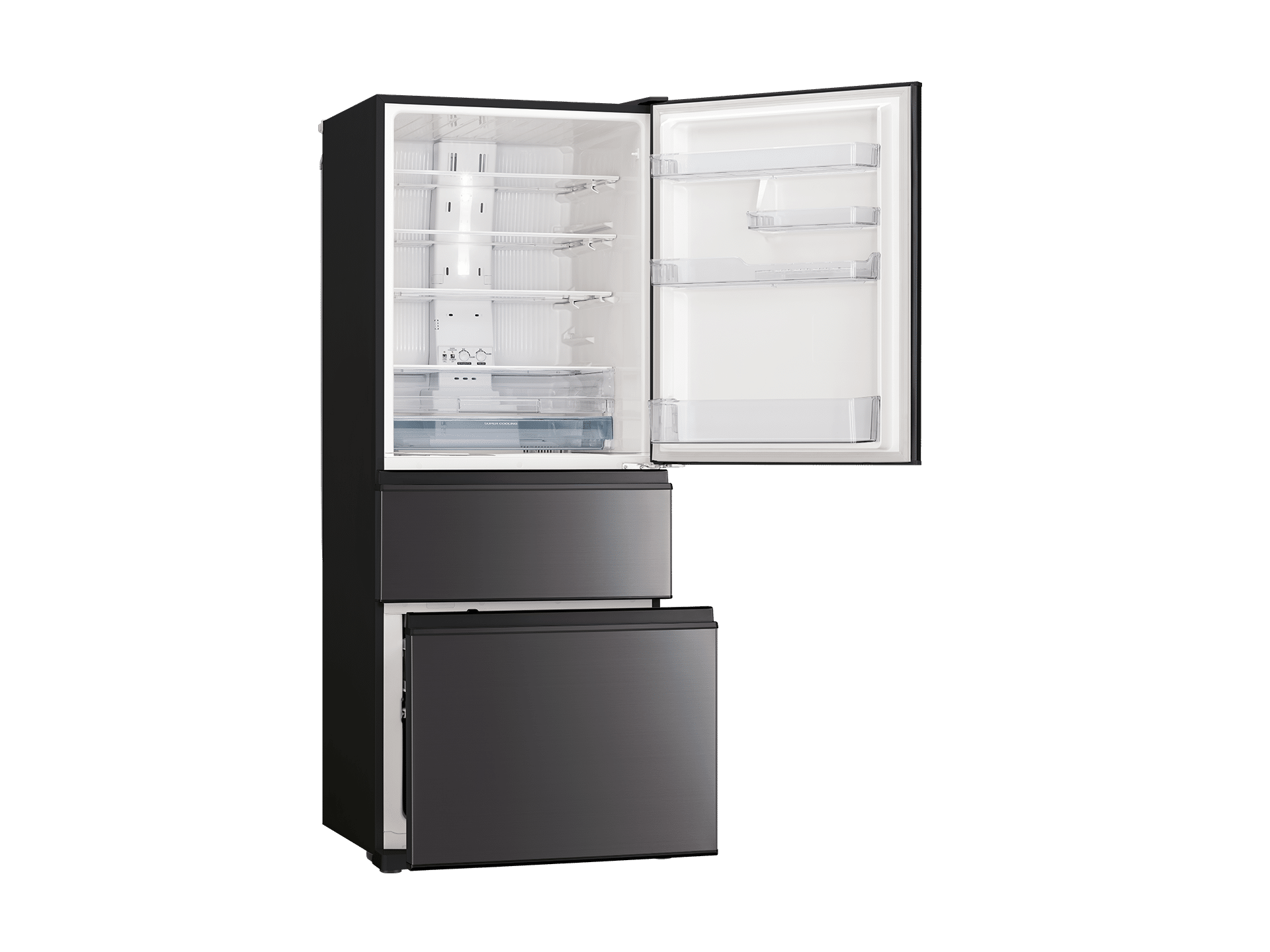 The Mitsubishi Electric 450L 3 Door Bottom Mount fridge is available in a range of steel and glass door finishes, depending on the series. These finish options let you choose a look that suits your kitchen design while maintaining the same internal layout, capacity, and core features across the range.